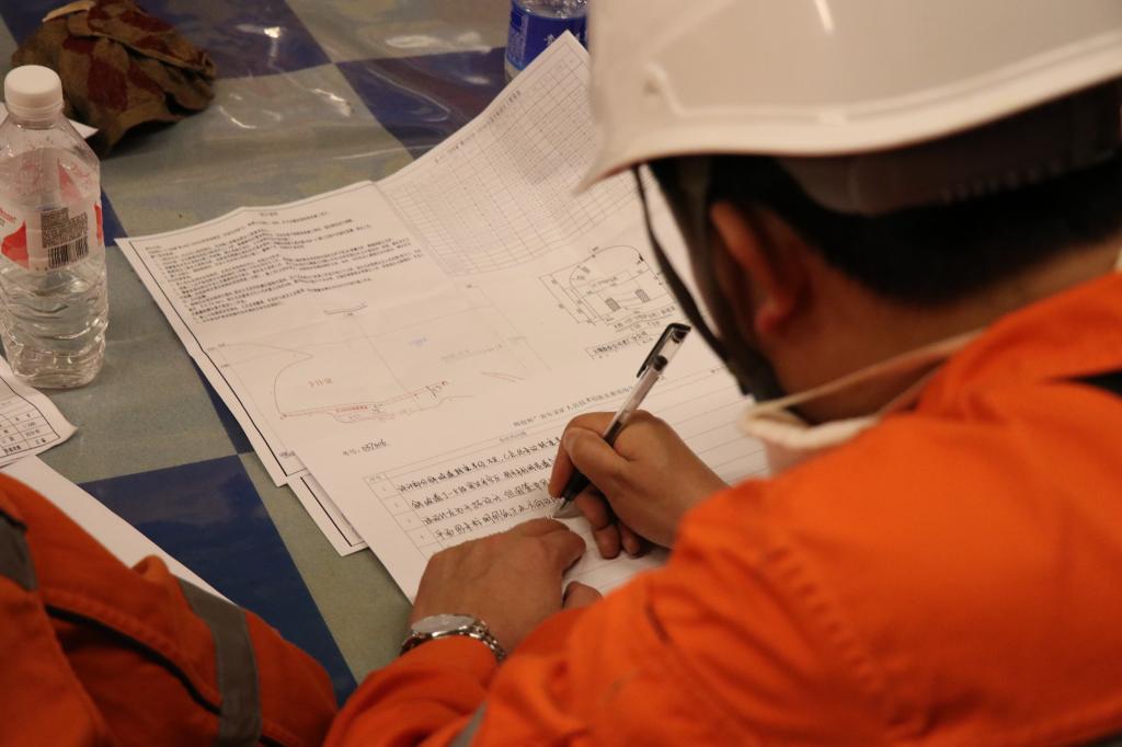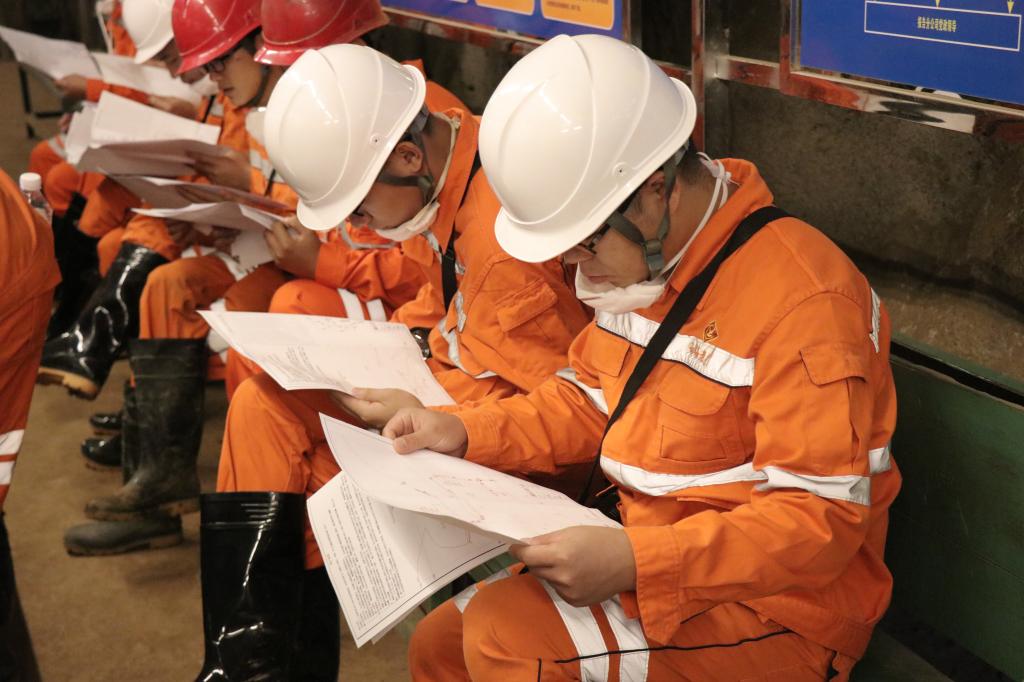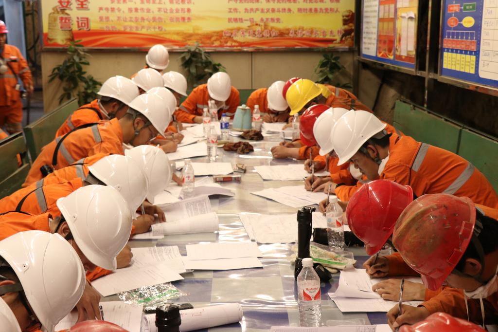 參賽人員經過安全員入坑安全培訓后前往本次考試地點塘子凹坑的主力采場3-11-5E,由于高手云集,最后一輪比賽標準更高,要求更嚴。比賽現場,選手們信心滿滿,躍躍欲試,氣氛嚴肅卻又不失親切。拿到考題后認真勾畫,緊抓重點。在迎頭上,選手們沉著迎戰,從容不迫,認真排查現場與施工單上“異樣”,反復查看,爭取不漏任何細節。