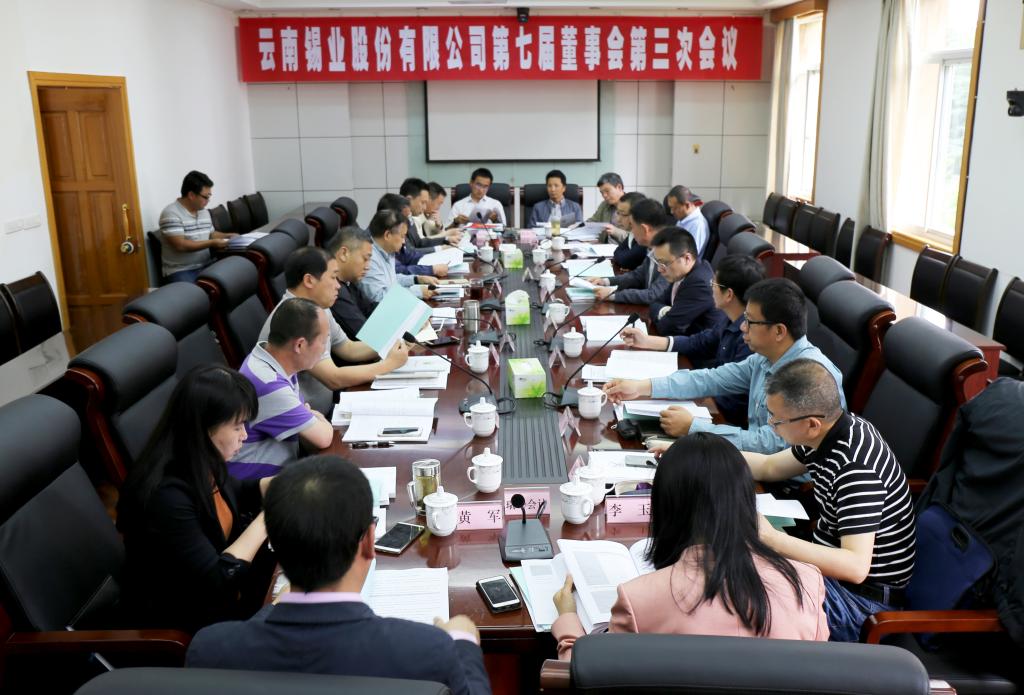 云南錫業股份有限公司第七屆董事會第三次會議于2018年4月25日在公司四樓一會議室以現場記名投票表決方式召開。公司董事會由10名董事組成,出席會議董事7名,由于工作原因無法參加本次董事會的3名董事分別委托董事會成員參加并代為行使表決權。公司董事長湯發主持會議。
