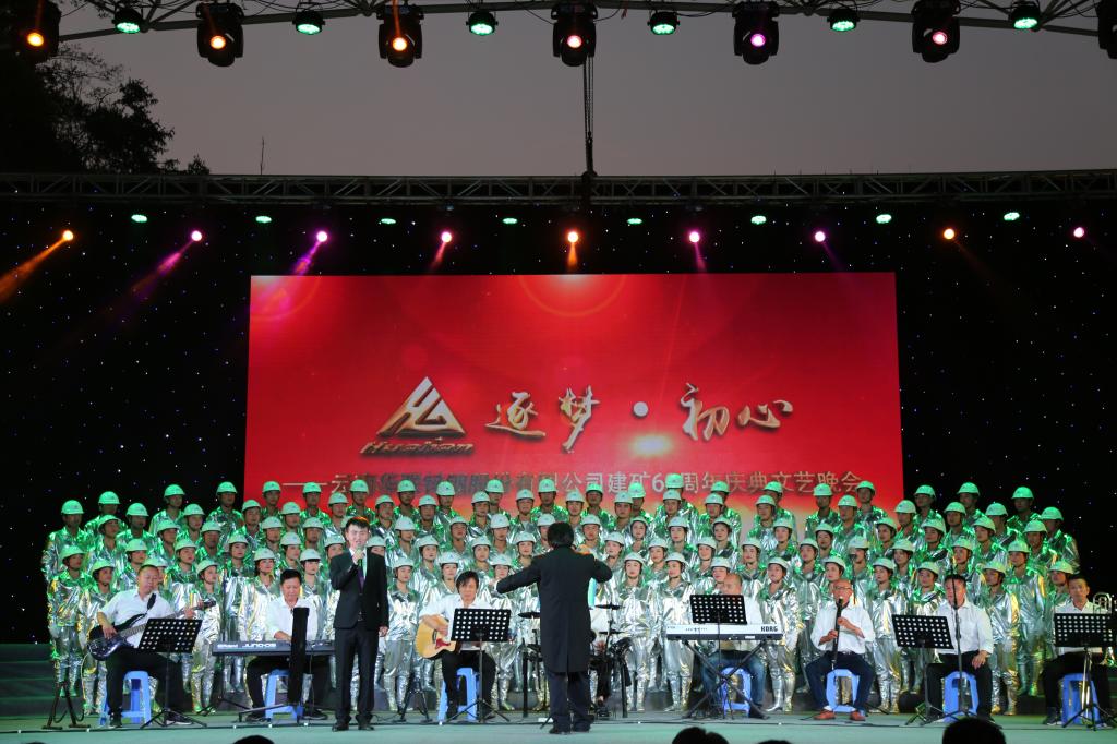 當天晚上19:00,華聯鋅銦“風雨征程六十載,繼往開來鑄輝煌”文藝晚會在公司籃球場正式拉開帷幕。控股公司黨委常委、副總經理程睿涵,錫業股份黨委書記、董事長湯發,錫業股份副總經理童祥及相關部門人員,來自文山州、馬關縣、都龍鎮三級黨委、政府及相關部門,昆明理工大學、文山日報及來自全國各地的友鄰企業領導,公司歷屆礦級主要領導、獲州級以上表彰的先進個人代表、退休老職工代表,現任領導班子成員、勞動模范和部分干部職工,共計500余人出席晚會。