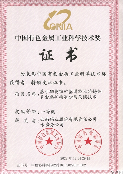 近日,卡房分公司負責的《基于磁黃鐵礦基因特性的銅錫多金屬礦精準分離關鍵技術》項目榮獲2022年度中國有色金屬工業(yè)科學技術獎一等獎。