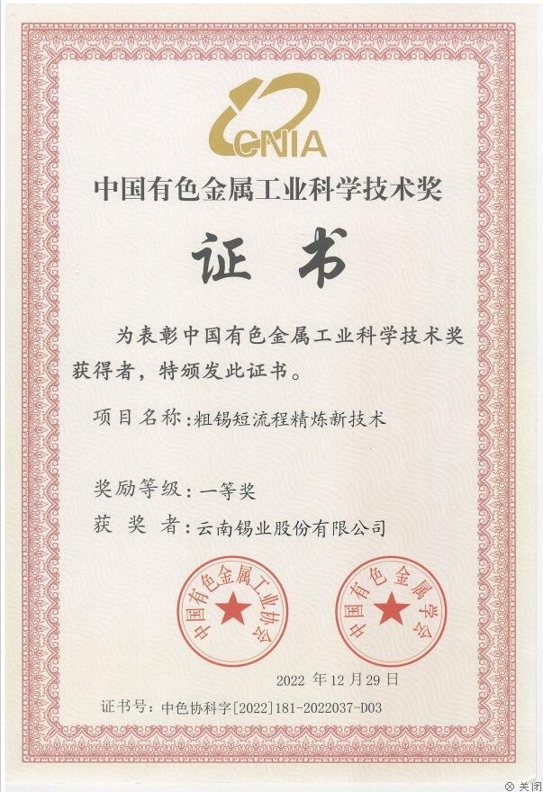 近日,中國有色金屬工業協會、中國有色金屬學會發布了榮獲2022年度中國有色金屬工業科學技術獎項目,由云錫控股公司牽頭負責,錫業股份錫業分公司、昆明理工大學、綠地環保共同參與的“粗錫短流程精煉新技術項目”榮獲2022年度“中國有色金屬工業科學技術獎一等獎”。