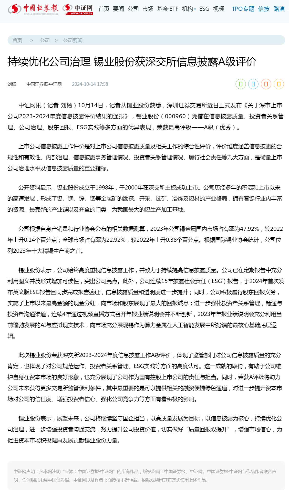中證網(wǎng):持續(xù)優(yōu)化公司治理 錫業(yè)股份獲深交所信息披露A級(jí)評(píng)價(jià)